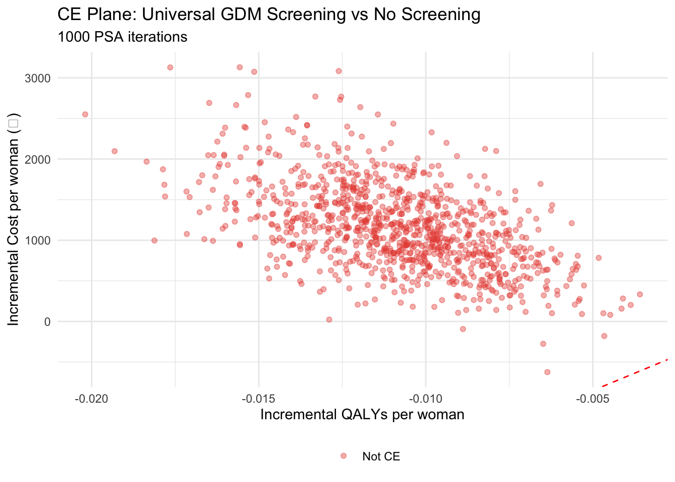 #| fig-cap: "Cost-effectiveness plane: Universal Screening vs No Screening (1,000 PSA iterations)"