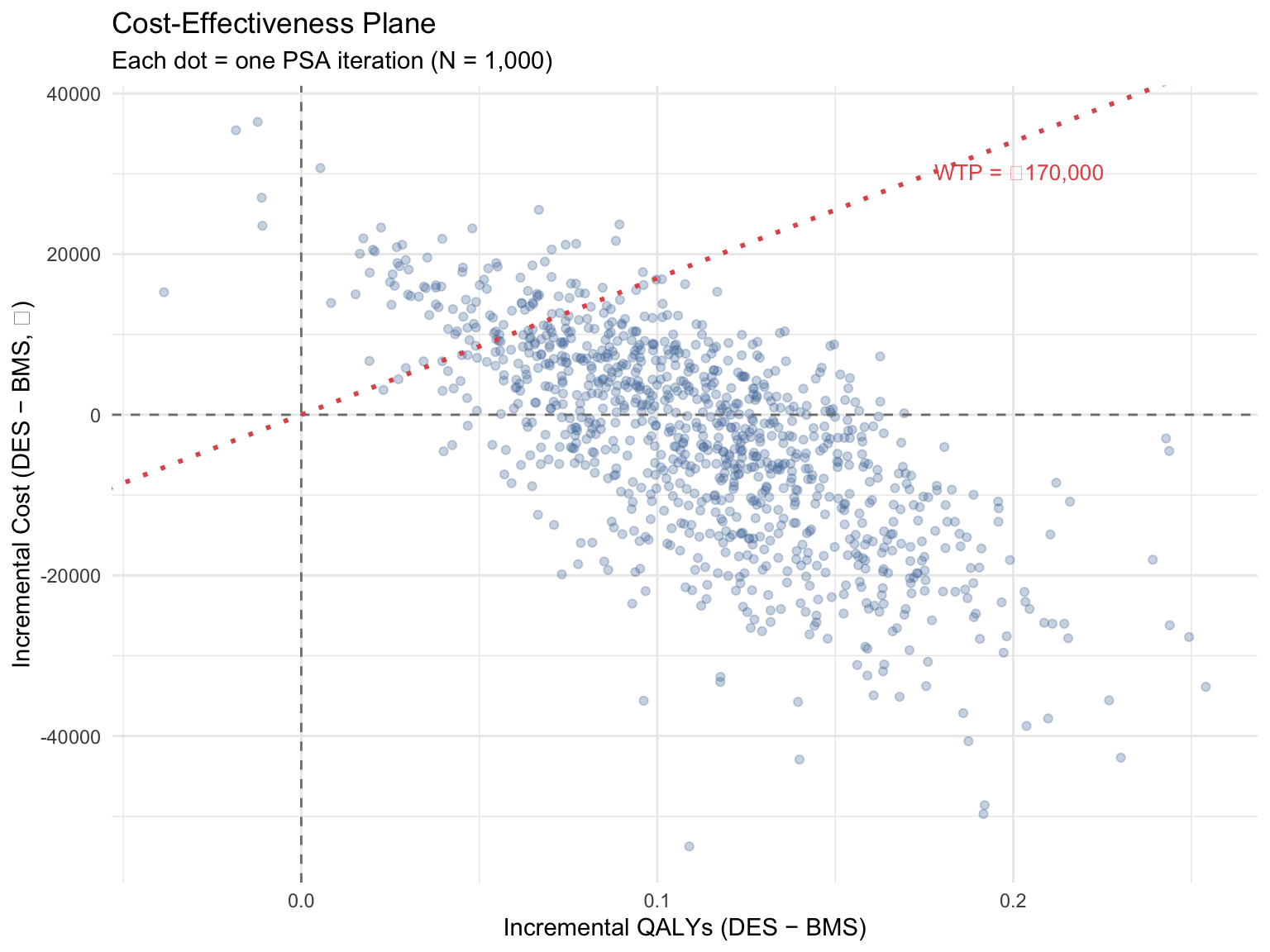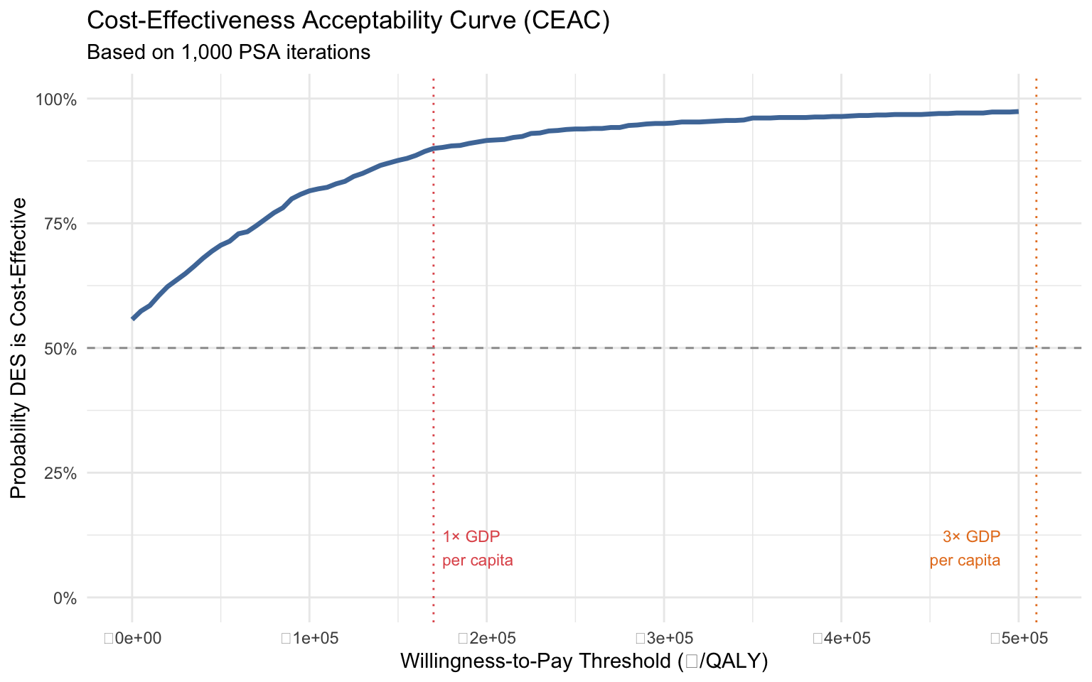 A single ICER says "DES is cost-effective." The CEAC says "DES is cost-effective with **X% probability** at threshold Y." This is what decision-makers actually need. Notice how we generated this entire analysis — PSA, CE plane, CEAC — with `rdecision` doing the heavy lifting.