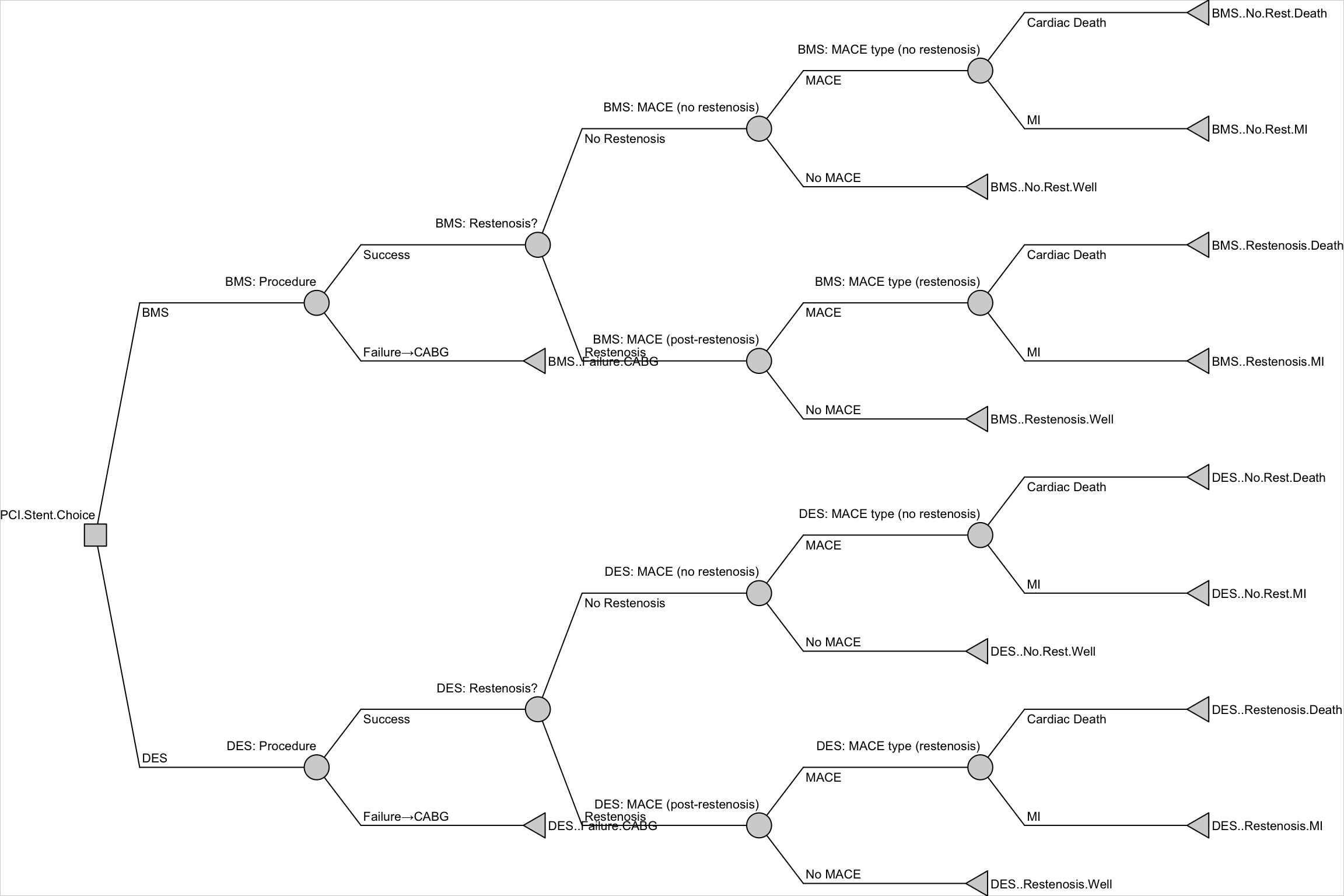 `rdecision` assigns costs to **edges** and utilities to **leaf nodes**. Our model has composite costs (e.g., initial PCI + stent + medications over 5 years) that we need to pre-compute so they can be attached to the right edges and leaves.