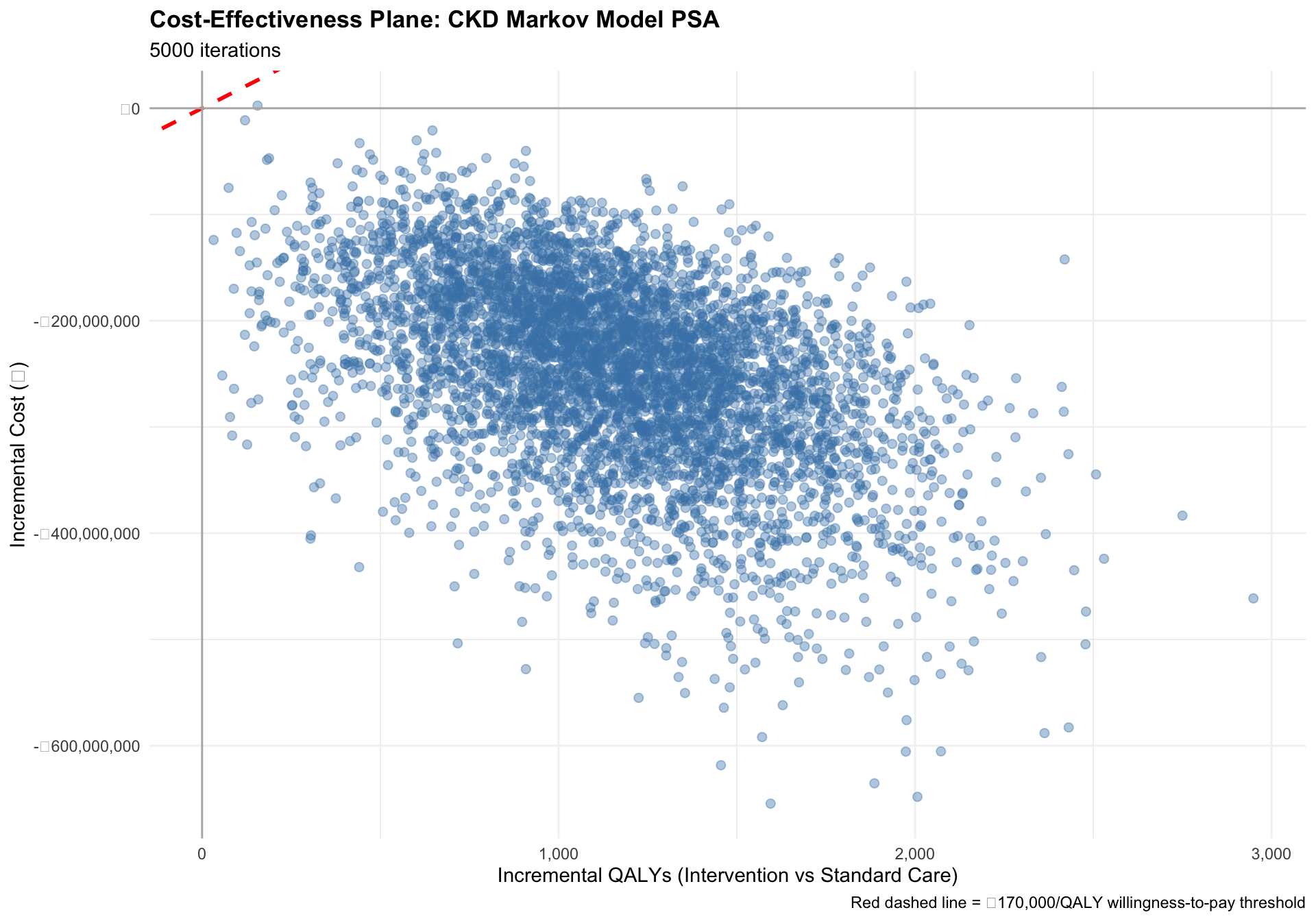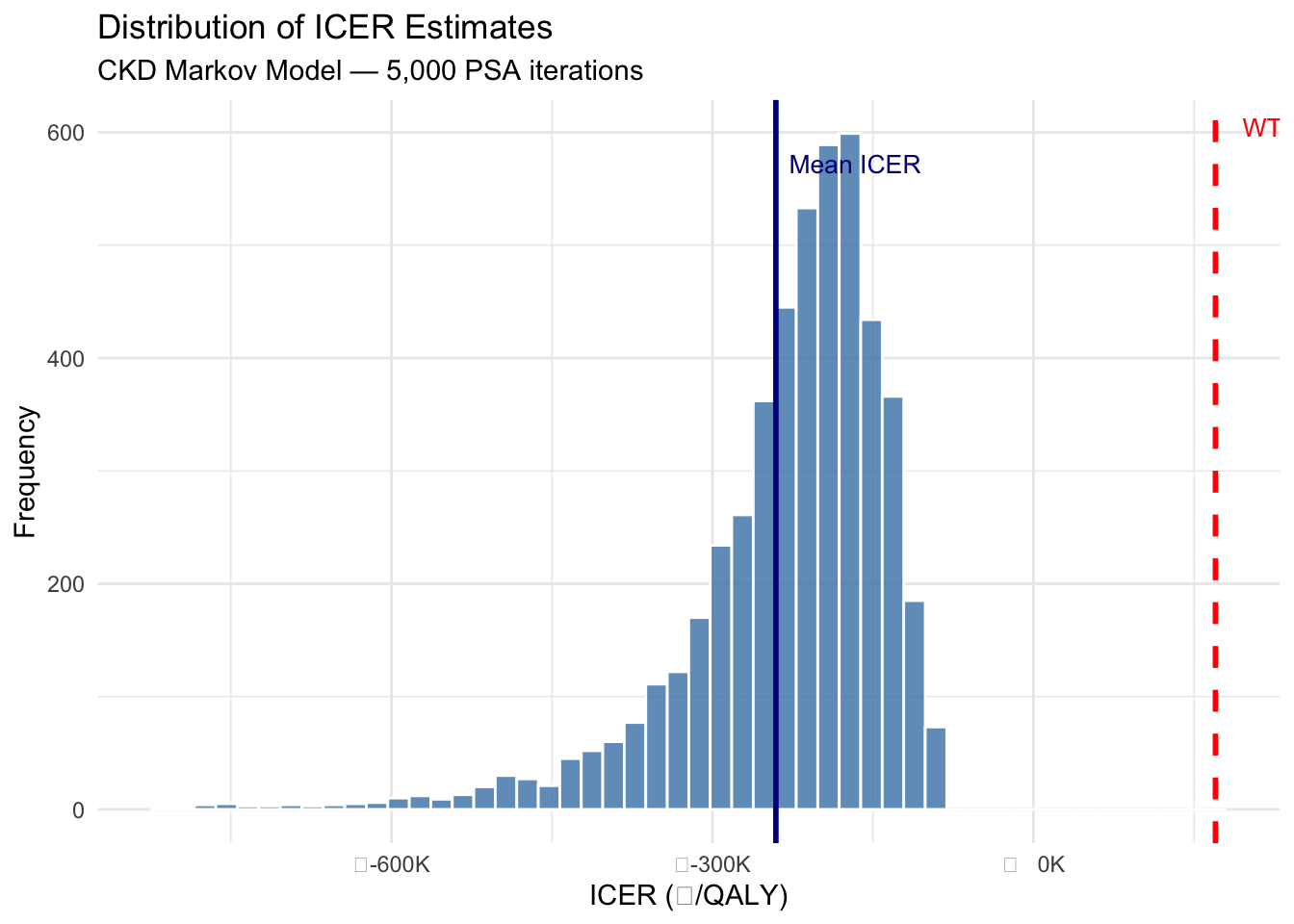 run_markov_psa) that accepts a set of sampled parameters and returns model outcomes. - Ran 5,000 PSA iterations in a loop, sampling from each distribution and recording results.