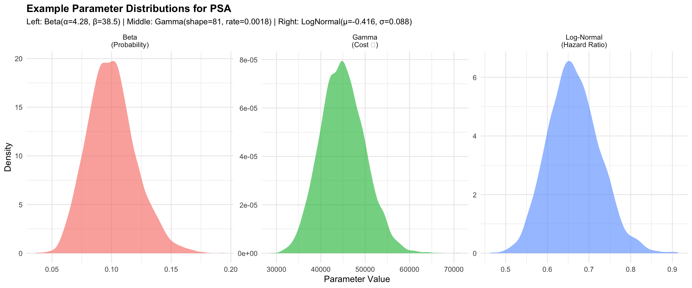 In health technology assessment, we rarely know parameter values with certainty. When you submitted a cost-effectiveness model to a journal or HTA agency using only point estimates—a single transition probability, a single cost, a single utility value—you were essentially claiming that these are the true values. But they are not. Every parameter carries uncertainty from the sources we used: clinical trials with limited sample sizes, cost data from particular regions, utility estimates that varied across populations.